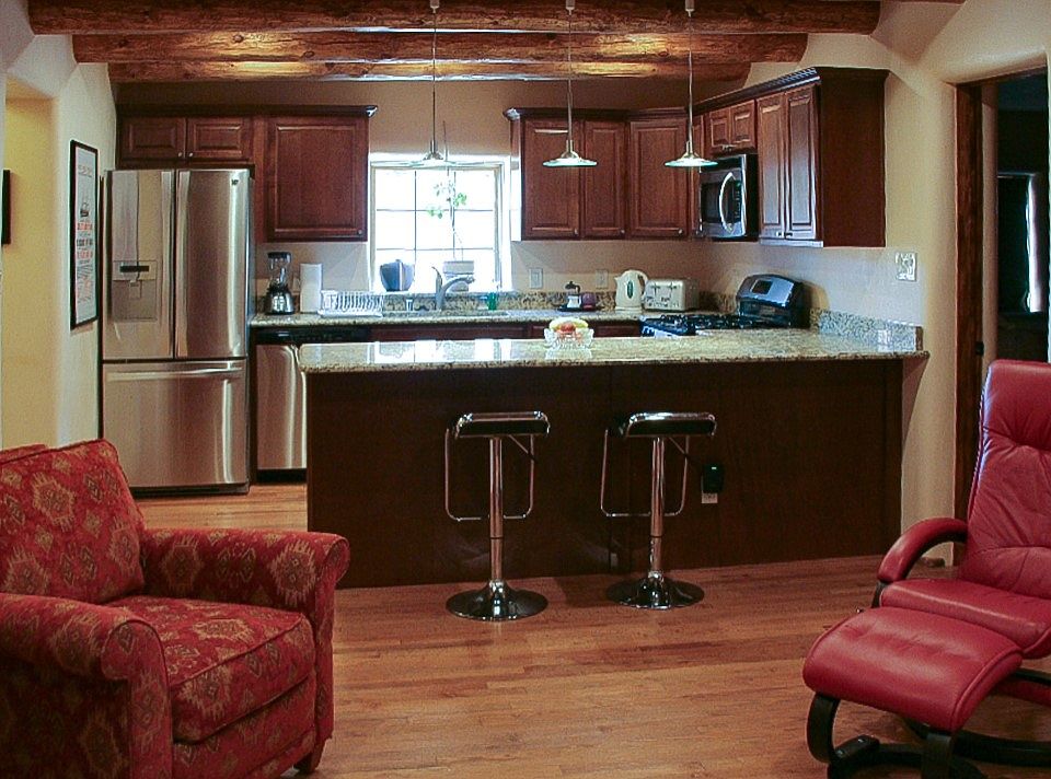 Predominantly Adobe with abundant charm! 3 Bedrooms and 2 baths (third bedroom is a flex space with an exterior door) with updates throughout. Kitchen has stainless steel appliances, including a wine refrigerator, and granite countertops. Outdoor spaces with mature aspen trees are cozy and inviting, while requiring minimal maintenance. Highly prized off-street parking for two vehicles. Superb location - close to the Plaza, shopping, entertainment and more than 20 restaurants. Currently a long-term rental, the home has a short-term rental history as well. This versatile property can serve as either a comfortable home or a source of supplementary income, depending on your vision.