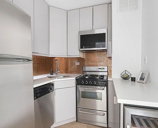 This south-facing studio spans approximately 400 square feet, bathed in natural light with open city views that create a bright and inviting atmosphere. The unit features a separate, classic kitchen that inspires culinary creativity, while a built-in mini wine fridge makes it especially appealing to wine enthusiasts. Ample closet and storage space ensure easy organization, complemented by sleek, custom window shades for a refined finish.