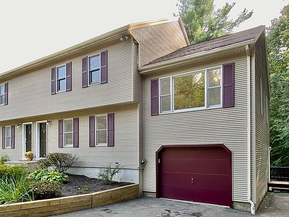 Comfortable Large tri-level Garrison colonial. Located in a lovely wooded setting just off rte. 68, abutting Mass Central Rail Trail and conservation land. There are 3 duplexes in this small condominium community with only 6 units. Each duplex has its own setting with a septic and well. This is a premier location on an estate setting with wooded views. These homes have expansive lawn areas, and exclusive use of driveways shown on the site plan as well as guest parking, etc. Great school system. Large cathedral living room, large eat in kitchen with lots of cabinet and counter space, oversized dining room great for upcoming holidays, first floor laundry off the kitchen. Trex decking and one car garage. Full dry basement. Very well insulated. Updated oil tanks and furnace. Low condo fees!