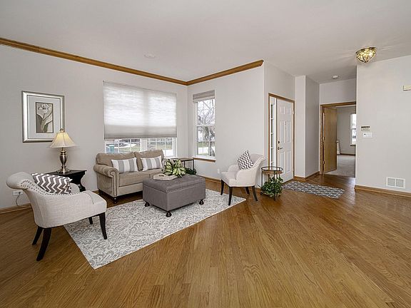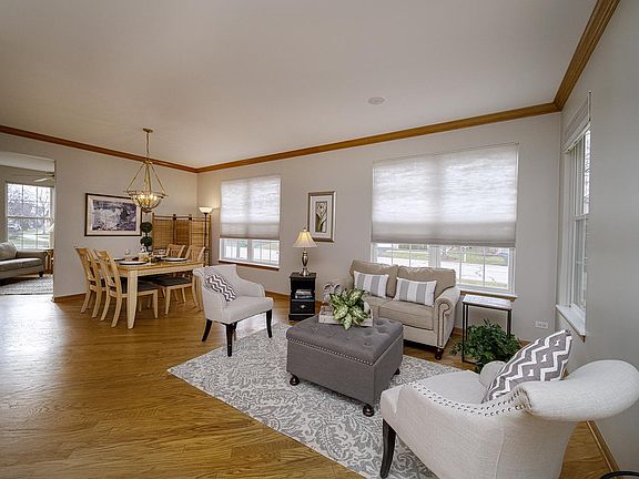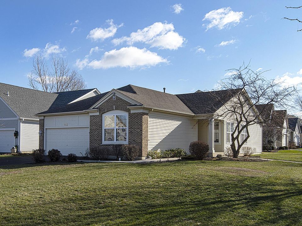 Former builders ranch is beautifully appointed. Warm hardwood flooring, brand new neutral carpeting, and freshly painted greige color throughout the first floor. Nine foot ceilings enjoy abundant light. Huge combined living and dining rooms makes for a wonderful way to entertain. Just imagine the holidays here. Kitchen boasts Corian counters, 36" hardwood cabinets with crowned tops and mood lighted tops, new microwave, all white appliances, cast iron sink, plenty of room for table and chairs, slider to private patio and green belt back yard. Two abundant master bedrooms are a feature of this home. Both enjoy full bathrooms and one is shared with the hallway for guests. Each are crowned with a ceiling fan. Both have walk-in closets for ample storage. The main master has an upgraded cathedral ceiling. A buyer will notice that the trim is an upgraded oak and the doors are flush oak as well. There is a third bedroom/office without a closet but there is a closet just outside the room itself. A first floor laundry is conveniently located near the garage entry and boasts cabinets and a utility sink also upgrades here. Don't miss the full finished basement rec room. This area expands the living space and makes this an great home for family fun and easy entertainment. Plus a wet bar conveniently located on ceramic tile which contains its own ice bucket and cooling station for wine and beverages. The exterior of this home also includes a sprinkler system and a brand new sump pump in the basement. Carillon North is a 55 and older community. It provides an inground heated pool, hot tub, club house, gated entry, snow plowing, and grounds care. Located minutes from downtown Grayslake and Metra. This is truly a remarkable place to settle.