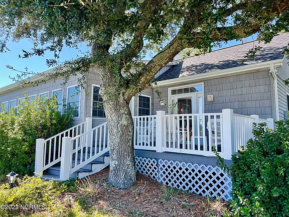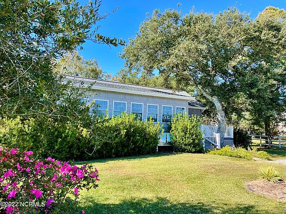 Adorable custom built ranch cottage on desirable Harkers Island. Bright and cheery home with lots of windows that bring the outdoors in, wainscoting in every room, extensive trim, custom doors, kitchen with bar and sitting area for entertaining, low maintenance on outside with composite decking/vinyl siding. Stately Live Oak trees shade this retreat for enjoyable casual entertaining on outside decks after a day on the water of fishing, swimming, shelling at Cape Lookout National Seashore known for its beautiful waters. The outdoor storage has running water, refrigerator/freezer, and window AC unit. New HVAC and Roof in September 2020, seamless gutters in 2018, and new side fence for privacy. Quiet street. Home comes furnished and ready to move in today. Not located in a flood zone. Conveniently located within walking distance to restaurant, grocery store and marina.