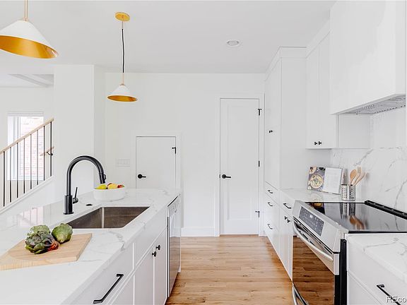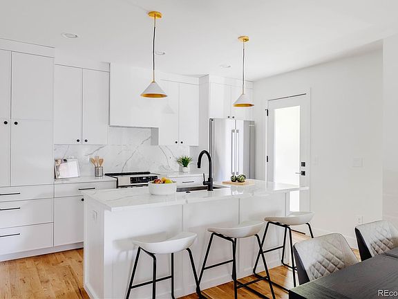 feel with metal accents and warm interiors. The home fully utilizes its outdoor space with a beautiful and serene back patio directly off the living room, plus an expansive rooftop deck with mountain and city views. The ground floor has an open floorplan anchored by a cozy fireplace in the living room and Calcutta quartz backsplash in the kitchen. On the second floor, the master suite unfolds through a series of French doors to display a standing tub and cloud chandelier. The 3rd floor offers privacy with two additional bedrooms, the larger of which floods with sunlight creating a calming environment perfect for an office or lounge. By utilizing progressive building practices, including high performance insulation, windows, HVAC and more, this unique home has superior comfort, noise reduction and energy efficiency. Listing agent Kellen Reilly hosting an open house Saturday 3/18 from 10am-12:30pm