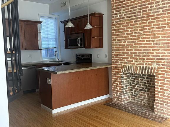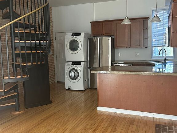 Open concept kitchen and living room in this 2 story, 2 bedroom apartment. Exposed brick and spiral staircase give it a chic, upscaled feel. Full size washer and dryer, central air and off street parking are a plus. Water, sewer, trash included. Tenant pays all utilities. Available August!