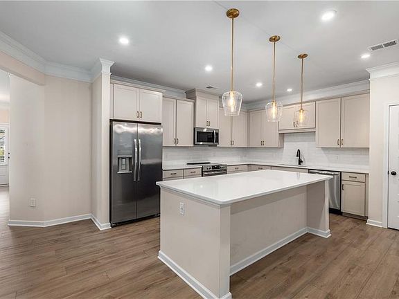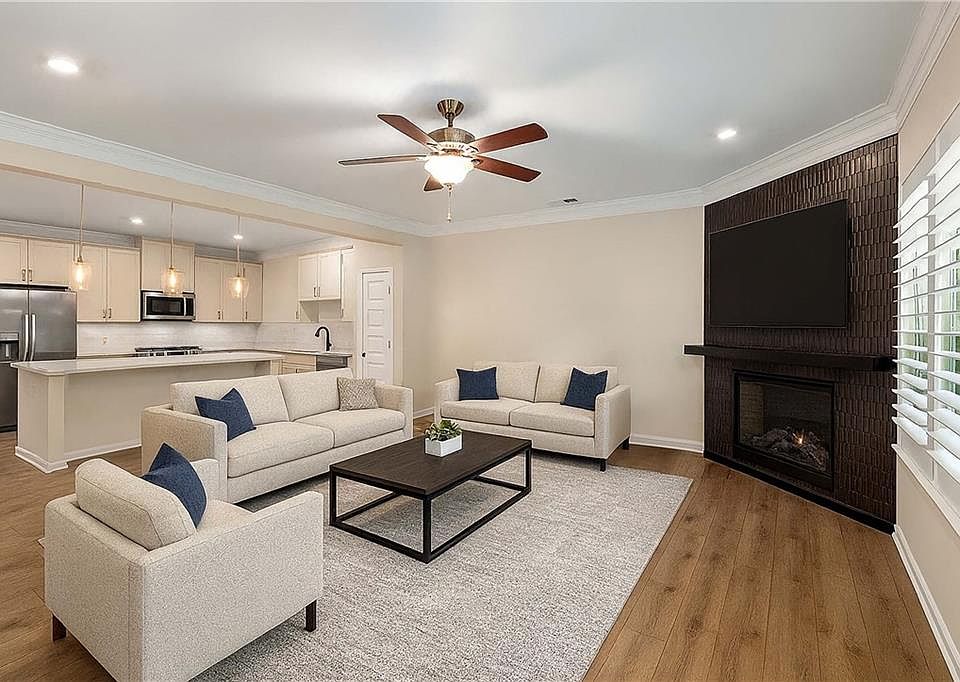 Cozy fireplacePrivate deckCrown moldingOpen layoutIron stair railsSolid surface countertopsSoft-close drawers