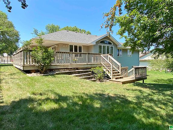 Looking for space, comfort, and convenience? Welcome to your new home in Le Mars, IA! This inviting ranch-style residence offers 4-5 bedrooms and is perfectly situated near the beautiful Schaefer Park. Step inside to discover a well-appointed kitchen featuring a handy peninsula, perfect for meal prep, casual dining, and even homework time with a built-in desk area. The dining area opens directly onto a spacious deck—partially covered—ideal for summer barbecues, entertaining friends, or simply relaxing outdoors. The main level boasts three generous bedrooms, including a large owner’s suite with a private bathroom and dual closets for all your storage needs. Enjoy the ease of main floor laundry—making daily chores a breeze. Head downstairs to the fully finished, walk-out lower level, complete with a versatile rec room, a wet bar/kitchenette, a full bathroom, and 1-2 additional bedrooms. The potential fifth bedroom features a walk-in closet and offers flexibility for guests, a home office, or hobbies (please note: current window may not meet egress requirements). A dedicated lower-level storage room keeps everything organized, while the home's layout and amenities provide the perfect blend of functionality and comfort. Don’t miss your chance to make this charming & spacious ranch style home yours!
