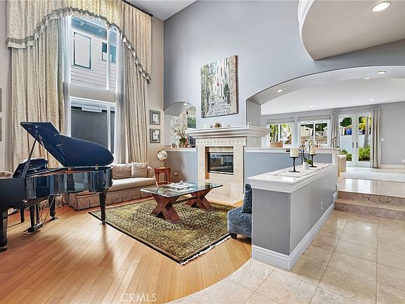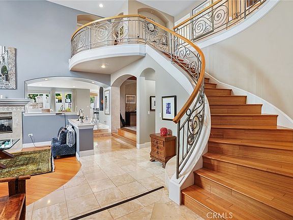 From the moment you arrive, the curb appeal sets the tone lush palms, a grassy front yard, and a striking double wooden door welcome you into a world of sophistication. Inside, the wow factor is immediate: soaring ceilings, a grand spiral staircase with wrought-iron railing, floor-to-ceiling windows, and a dramatic open floor plan built for entertaining.