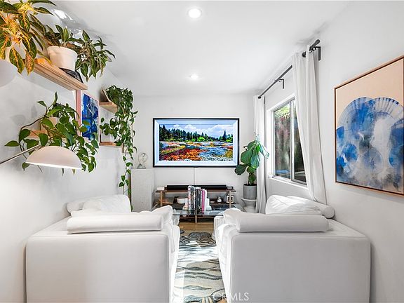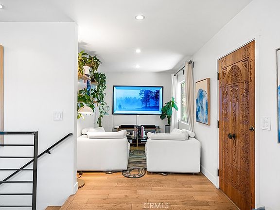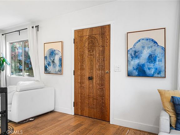 Tucked behind a privacy fence, this updated home offers a thoughtfully designed blend of indoor-outdoor living at the nexus between Silver Lake and Echo Park. A one-of-one custom carved wooden front door opens into an airy floor plan featuring light-toned wood flooring throughout the living, dining, and flexible-use spaces. The kitchen showcases a clean navy and white palette, accented with brass hardware, a premium Wolf range, and direct access to a spacious balcony —well-suited for outdoor dining or casual gatherings.