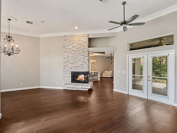 One or more photo(s) has been virtually staged. Located in the established Cross Creek neighborhood of DeLand, this three-bedroom, two-bath residence has been thoughtfully and tastefully renovated for modern living. The home is situated on a cul-de-sac street, providing privacy and minimal traffic, while its one-third acre lot offers ample outdoor space. Inside, wood floors extend throughout the residence, creating a cohesive and warm aesthetic. The updated kitchen features a blend of shaker-style cabinetry and open shelving, complemented by quartz countertops and an island with seating. A tray ceiling adds architectural detail above, while the electric cooktop and wall oven/microwave combination provide functionality for cooking and entertaining. The split-bedroom layout places the primary suite on the western side of the home, while the two additional bedrooms are located on the eastern side, offering separation and comfort. The two-sided wood-burning fireplace is located between the dining room and the kitchen and is highlighted by beautiful stone. Additional highlights include a side-entry two-car garage with an extended driveway, accommodating multiple vehicles, and a cozy backyard with potential for outdoor living enhancements. The screened rear patio overlooks the mature landscaped yard. NEW WATER HEATER (Sept 2025) NEW HVAC (Oct 2025). This property offers convenience as it is just nine minutes from the historic downtown DeLand, known for its shops and dining, and close to the acclaimed Stetson University.