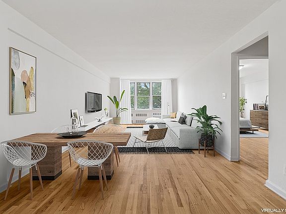 Flooded with natural light, the apartment has been tastefully updated throughout. The expansive living and dining area easily accommodates both everyday living and entertaining. The renovated kitchen features crisp white cabinetry, stone countertops, stainless steel appliances, and a modern tile backsplash. A king-size bedroom overlooks leafy treetops and offers excellent closet space, while the fully updated bathroom boasts contemporary tilework, a new vanity, and sleek fixtures. Additional highlights include refinished hardwood floors, fresh paint, and abundant storage.