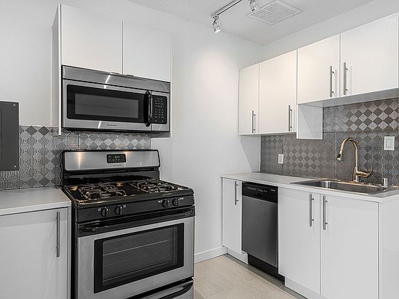 The kitchen: Modern style with plenty of cabinetry. Appliances include a built-in microwave, dishwasher, refrigerator, and gas range. A faux metal backsplash compliments the stainless steel appliances.