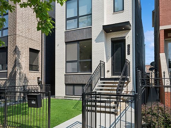 Newly constructed in 2023, this elegant single-family home in West Town seamlessly blends modern luxury with functional design. This 5-bedroom, 4.5-bathroom residence features a full rooftop deck, a garage deck, and a spacious grass front yard and backyard. Lumini windows and 6.5-inch wide-plank hardwood floors enhance the interior's sophistication. The open floor plan showcases a bright, south-facing living and dining area with a quartz-surround fireplace. The gourmet kitchen boasts high-end Thermador appliances, Brizo fixtures, and a large quartz island. Post-construction upgrades include high-end motorized window shades, custom closets, and dual HVAC systems for year-round comfort. The second floor offers three bedrooms, each with en-suite bathrooms, and a convenient side-by-side laundry closet with a countertop. The primary suite features two spacious closets and a spa-like bathroom with an extended double vanity, heated floors, a freestanding soaking tub, and a multi-jet glass shower. The lower level includes two large bedrooms, a recreation room with a den and wet bar, a full bathroom, extra storage, and an additional laundry hookup. The recreation room's den, enclosed by barn doors, provides versatile space for an office, gym, or guest room. Ideal for entertaining, the home features a stunning rooftop deck with skyline views and a backyard perfect for grassy turf or a paved patio. A two-car garage with an additional deck expands outdoor living options. Located in vibrant West Town, steps from West Loop, this home is surrounded by top-tier restaurants and boutique shops.