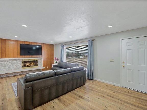 On the main level, you'll find a full bathroom and a laundry room combined with a half bath. The living room includes a TV with premium audio, a gas fireplace, two leather sofas, a coffee table, and two end tables.