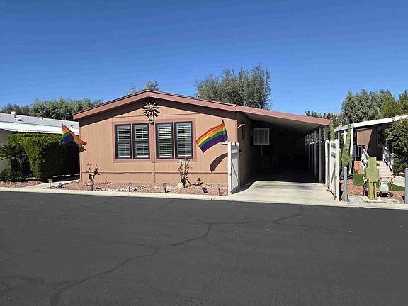 This 1988 Skyline manufactured home, with 1258 square feet of living space, two bedrooms, and 1 3/4 baths, is an oasis of tranquility and good taste in fabulous Vista Montana, the 'Gem Of The Desert'. The home has a split bedroom floorplan - the bedrooms are at opposite ends of the house for maximum privacy. The primary entrance to the house is via the west-facing covered deck, an area perfect for entertaining or relaxing while enjoying the expansive greenbelt views. A small concrete slab patio area is nestled near the rear of the property and is easily accessed by the deck. An adjacent second patio, made of concrete pavers and located at the back of the home, offers one of the best views in all of Vista Montana and is the perfect place to entertain guests or relax with morning coffee or evening wine. The front door enters into a large greatroom with vaulted ceilings and newer carpeting (which runs throughout most of the home). Opposite the front door is the kitchen, with an abundance of white cabinetry and newer stainless steel appliances. The dining area is adjacent to the kitchen and is open to the living room. At the southern end of the home is the larger of the two primary bedrooms; this bedroom has a full ensuite bath, a large reach-in closet, and plantation shutters. At the opposite end of the home, down a short hallway, lies the second primary bedroom with a remodeled three-quarter bath and walk-in closet. The laundry room, with a full-size washer and dryer, has direct access to the gated carport. Vista Montana is an active 55-or-better community with a large clubhouse, two pools, two spas, shuffleboard, fitness center, and more. Call today for your private showing.