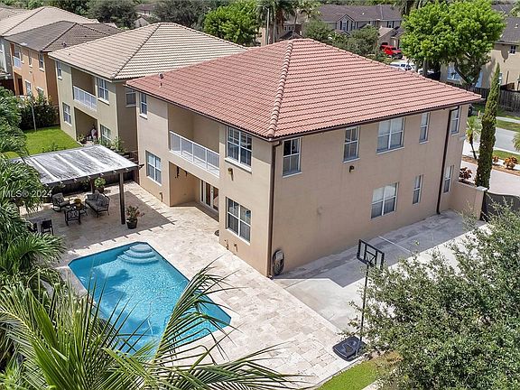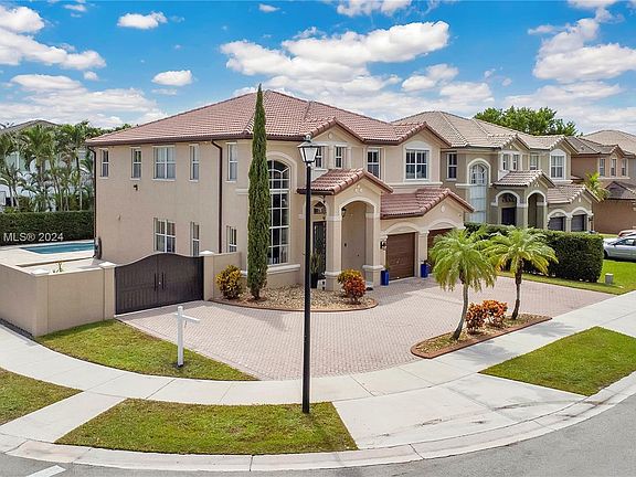 Corner, Mediterranean style house with 4 bedrooms and 3 bathrooms, with pool and lots of entertainment space in the highly desirable area of Tamiami. This house with 3,200+ sq. ft. of construction is a two-story single-family residence very well maintained. Security system and cameras come with the house. High ceilings throughout and stunning ceramic floors. A full bedroom and bathroom downstairs for convenience. Ample Family room with pre-wiring for buyer's surround system. The eat-in kitchen has stainless steel appliances, ceiling-high cabinets, and double sink. The backyard has a covered terrace with travertine tiles and a full kitchen, perfect for outdoor entertainment. Convenient side entrance to park additional cars or toys, in addition to the large driveway and double car garage.