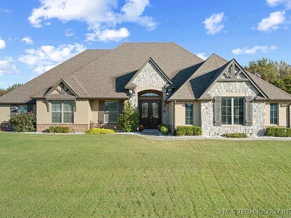Welcome to this exquisite custom-built home in highly sought-after Homestead in the Owasso School District. Just outside the city limits, this stunning single-story residence is designed with both elegance and functionality in mind. With 3 bedrooms, 2.5 bathrooms, PLUS a designated office, this home offers up-scale living with thoughtful details and exceptional craftsmanship throughout. As you step inside the spacious entry, French doors open up to the private office with vaulted ceilings and natural lighting. Make yourself at home in the warm and inviting living area featuring a soaring cathedral ceiling, a striking stone fireplace, expansive windows and custom built-in shelving and cabinetry. The chef inspired kitchen is an entertainer's dream boasting upgraded stainless-steel appliances, a generous island perfect for gathering, abundant cabinetry for storage and a large dining area. Wake up to beautiful views of the wooded greenbelt and sparkling pool from the private master suite with adjacent spa-like bath and large walk-in closet. Just off of the master closet is an oversized laundry room that leads to the custom drop zone. Make your way to the opposite side of the home and find a versatile game room/theater room providing the perfect space for family fun or movie nights. Two additional guest bedrooms with walk in closets and a sprawling guest bathroom ensure enough space for all. Don't miss the flexible bonus room that easily transforms into a home gym, playroom or 4th bedroom. Outside is like your own private retreat! Relax by the gunite pool with the ambience of tranquil water features and elegant fire bowls. Enjoy watching deer and wildlife from your own backyard. The neighborhood offers a park, stocked ponds, frisbee golf and is within walking distance to popular Centennial Park! This property checks all of the boxes!
