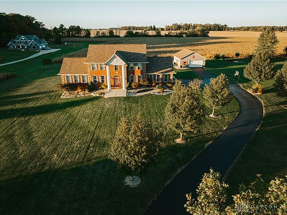 Welcome to your dream home — a stunning, custom-built brick colonial that perfectly blends timeless elegance with luxurious modern living. Nestled on 1.78 picturesque acres in Brookville School District, this 4-bedroom, 3.5-bath masterpiece offers over-the-top craftsmanship and every amenity you could want. Step inside to find a grand open staircase and landing, soaring 9-foot ceilings in all rooms, and a gourmet kitchen that will impress any chef — featuring a granite island, double ovens, a 48-inch refrigerator, bar area, and a sunny breakfast room overlooking the backyard. The great room steals the show with its 27X23' layout, cathedral ceilings, a massive fireplace, and a wall of windows that floods the space with natural light. Upstairs, you’ll find four generously sized bedrooms, each featuring plush carpeting, expansive closets, and an inviting sense of comfort — perfect for family or guests to enjoy their own private space. The primary suite is a true sanctuary, complete with a private deck, elegant tray ceiling, huge walk in closet, and a spa-inspired en suite featuring a jetted soaking tub — the perfect place to relax and recharge. The fully finished walkout basement expands your living space even more, featuring a 28x24' rec room that easily fits all your favorite game tables and even a high-definition projector setup. There’s also a 19X14' playroom, a 11X10' dry bar, and a storage room for all your extras. Step outside to enjoy the outdoors on the two-tiered deck, complete with a covered area wired and ready for your future hot tub. The backyard offers a thriving garden, apple trees, and a space to raise chickens. With a 3-car attached garage and a 40X30' outbuilding, there’s room for all your hobbies, vehicles, and toys. This home truly has it all — space, luxury, and charm, all in one incredible property. Make it yours before it's gone!