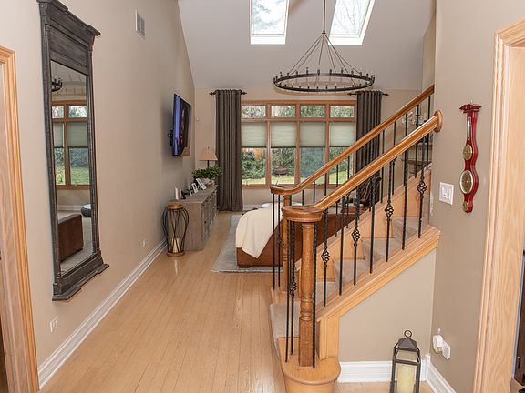 Stunning custom brick/stone 2 story home in Lockport's desirable Whispering Pines. Mature lot with towering pine trees and elegant curb appeal. Open floor plan with 16' ceilings and multiple skylights to illuminate the ornate hardwood floors throughout the entire home. The Fireplace on the first floor makes this home hospitable for gatherings of family and friends. First floor master suite with glamour bath includes whirlpool tub and separate shower. There is a chic main level office with elevated ceilings, great for a professional workspace. Fabulous kitchen with updated appliances and granite countertops. First floor laundry room with frontloading washer and dryer. Enormous mudroom/walk-in closet on the main level. Your clients will love the upscale decor this home has to offer. The remaining four bedrooms upstairs including an impressive 2-story great room with 16' ceilings and additional skylights. Spacious unfinished English basement with natural light and access to the garage. This home comes equipped with zoned heating and air conditioning units, security system, and microphone system. Home is located at the end of street making it feel private/secluded. Ready to upgrade your home this spring, schedule your private showing today.