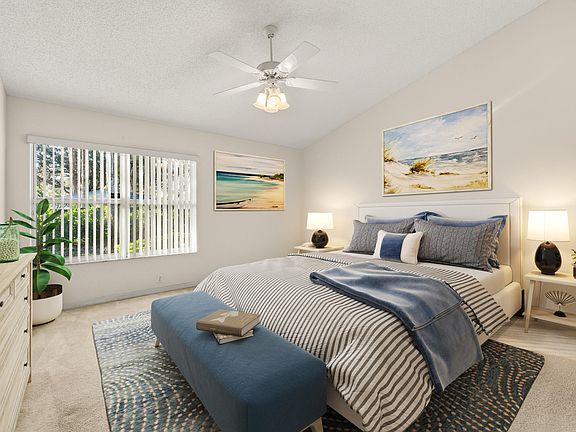 This villa is tucked away in a private corner of this desirable 55+ activity-rich community, offering added privacy and natural light and steps away from the clubhouse and tennis courts. This 2-bedroom plus den home features tile flooring throughout which adds durability and easy maintenance. The bright kitchen, vaulted ceilings, and large windows flood the space with natural light. Accordion shutters provide peace of mind. A split floor plan offers excellent privacy for owners and guests. Community amenities include two pools, clubhouse, fitness center, ballroom, arts & crafts, 9-hole mini golf, and more. HOA includes lawn care, cable, and irrigation maintenance. Conveniently located 6 miles to the beach and 4 miles to downtown Atlantic Avenue.