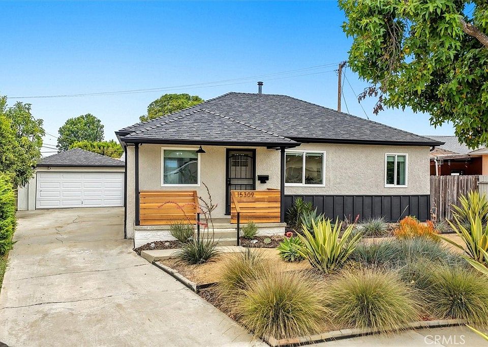 On a quiet, tree-lined street in El Camino Village, this home blends timeless charm with extensive renovations. The location is tucked off the main road with less traffic, beautiful mature trees —perfect for morning and evening walks. Inside, the home feels open, light, and warm, with a down-to-studs kitchen and bath renovation featuring quartz counters, stainless steel appliances, new cabinetry, tile, dishwasher, sink, and under-sink RO filtration system, plus updated piping and modern finishes in the bath. New dual-paned windows and doors, laminate floors, refinished hardwoods, recessed lighting, a custom porch fence, and drought-tolerant landscaping with fruit trees all add to the appeal. Major upgrades include a new water heater, updated 200A electrical panel, PEX piping, and a new HVAC system with heat pump. The backyard offers a covered patio, and privacy, with a detached garage, new slab and door, and a long driveway with RV potential. All this just minutes from Alondra Park, El Camino College, shopping, dining, freeways, and ~5 miles to the beach. Zoned for California Distinguished Mark Twain Elementary.