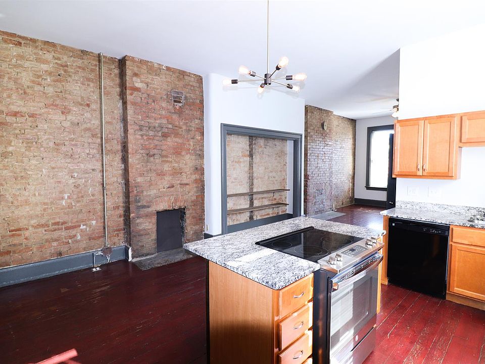 High vaulted ceilingsGranite countertopsExposed brickUnique light fixturesBrand new appliancesHardwood floorsFully equipped kitchen