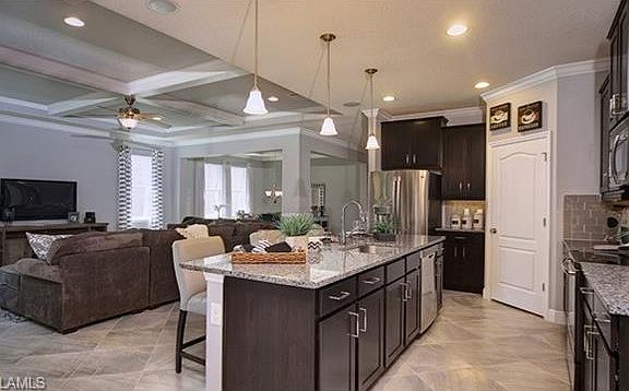 Proudly presenting the Camden, a unique multi-generational plan which offers the convenience of 4 bedrooms all on one level and featuring a 3-car garage. The separate living quarters complete with kitchenette makes this home perfect for many situations. This home is located on an oversize end-lot with a tranquil natural preserve view and no neighbor on one side. Beautifully appointed upgrades include: stainless steel appliances, granite kitchen counter tops, 42 inch cabinets, tile throughout main wet areas, tray ceilings, crown molding in Master and living areas and 5 inch baseboards throughout the home. The exterior features a designer pool package, a lushly landscaped home site and includes brick paver walkway, driveway, and lanai. Mockingbird Crossing is a private and secluded gated community in Naples featuring one-third acre lots with low association fees! Conveniently located off Vanderbilt Beach Drive this community gives you a central location to all the major amenities Naples has to offer like Mercato, Waterside Shops, and Gulf Beaches. Pictures are of a model home and not of actual home, finishes may vary.