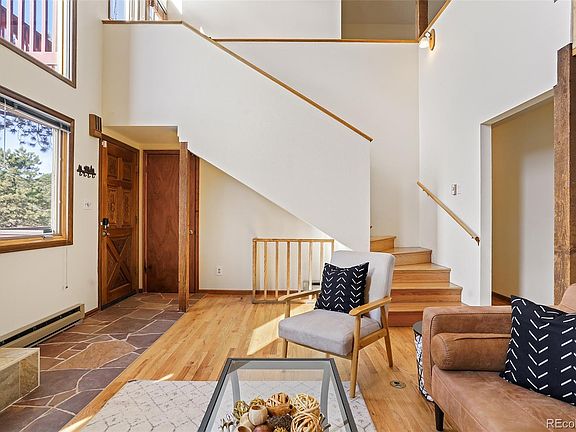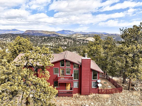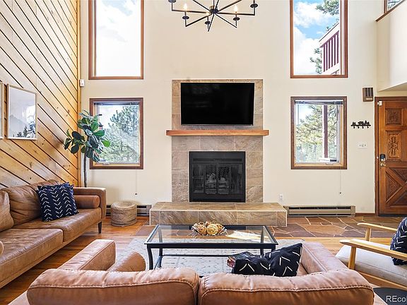 Majestic views of the Colorado landscape permeate every inch of this enchanting oasis. A hilltop orientation immerses residents in blissful serenity, crafting a connection to nature inside and out. Enter into a two-story great room grounded by a fireplace — the warmth of which is amplified by floor-to-ceiling wood paneling. Expansive windows illuminate the nearby dining area, where gorgeous views create a stunning conversation piece. The kitchen makes excellent use of space with abundant cabinetry, stone counters and seamless access to the outdoors. Each spacious and sunlit bedroom is equipped with its own bathroom for a true sense of privacy. Among these oases is a primary suite with a sumptuous corner soaking tub. A spacious loft area offers flexible uses as a recreation area, additional sleeping quarters and more with access to one of the home’s three deck/patio spaces. The location places residents within an hour of Denver and allows for ample wildlife spotting opportunities.