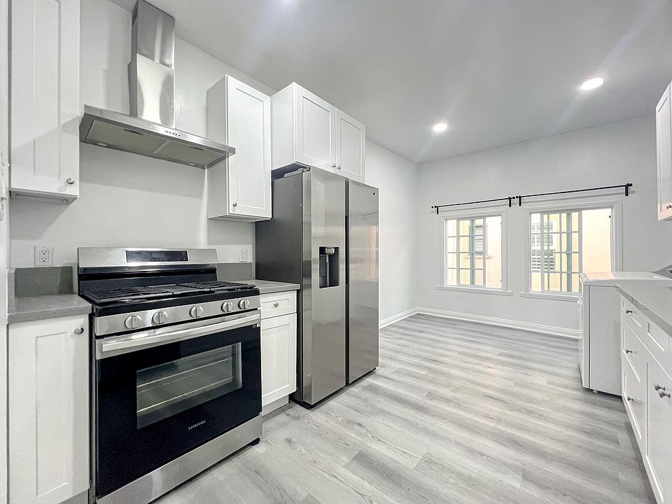 Net monthly rent $2,870 with 2 weeks free - base rent $2995. Newly renovated fourplex on a quiet street of Picofair Village! This Mid-Wilshire residence is a sundrenched 1,100 sqft 2 bed/1 bath unit - that includes 1 private garage/storage space. Throughout the unit, you will be met with modern convenience and old-world charm. FEATURES: - 2 Bed/ 1 Bath Approx 1,100 sq ft - 1 Private Garage Space - Brand New Modern Flooring - Recessed Lighting - High Ceilings & Arched Doorways - New Quartz Kitchen Countertops - Brand New Stainless Steel Appliances (Fridge, Gas Range Stove, Dishwasher) - Modern White Shaker Cabinetry - In Unit Washer/Dryer - A/C In All Units - Large Living Room + Dining Room - Beautiful Marble Tile Bathroom with New Vanity - Pets OK with Additional Deposit - Owner Pays For Water Conveniently located just minutes away from Beverly Hills, West Hollywood, Century City, Fairfax District, LACMA, and Miracle Mile shops & restaurants. Owner pays for water. Pets OK with an additional $500 deposit. 12 month lease. 1 month security deposit upon approved credit 600+ credit 2.6X gross monthly income