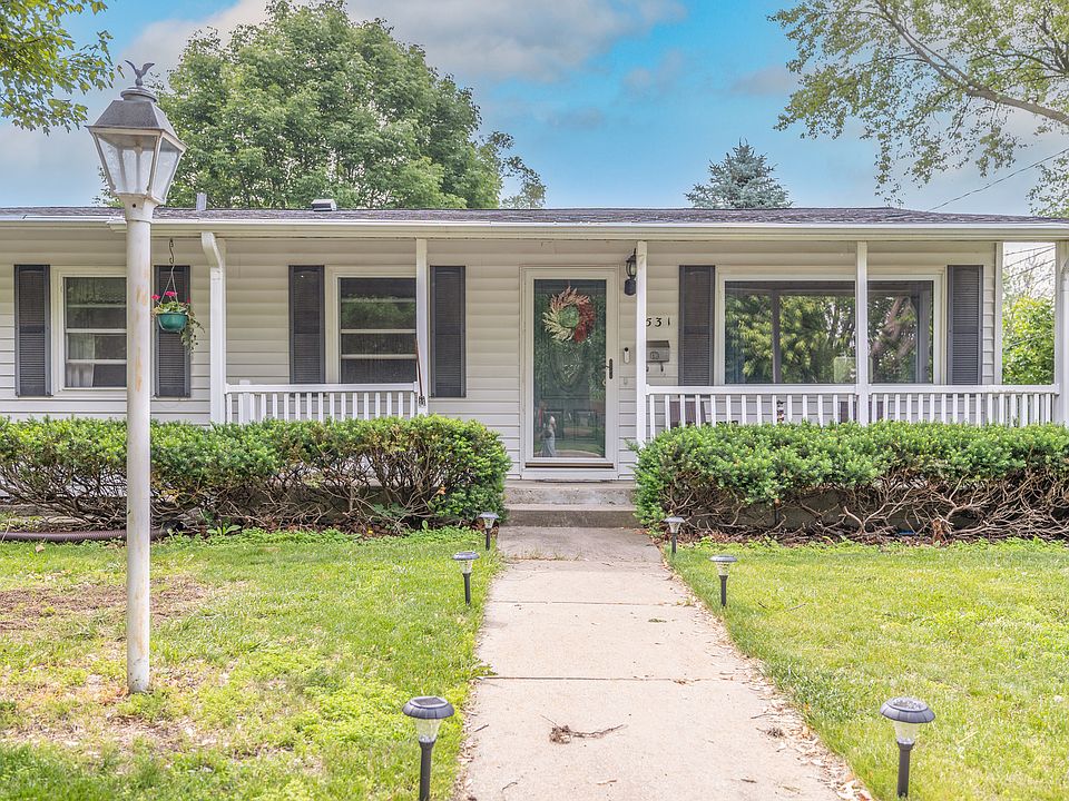 This exceptional ranch-style home at 1531 Sunrise Drive in DeKalb, Illinois, offers a perfect blend of comfort, convenience, and charm. Nestled on a desirable corner lot with mature trees and meticulously maintained landscaping, this property provides a serene oasis just moments from everything you need. Its prime location places it within easy reach of Welsh Park, and the bustling Sycamore Road shopping district, ensuring a lifestyle of ease and accessibility. Step inside this well-maintained residence to find a spacious layout featuring 4 bedrooms and 2 bathrooms, ideal for families or those seeking ample living space. The home boasts both a formal living room and a cozy family room, complete with a freestanding gas stove/fireplace that creates a warm and inviting ambiance. Throughout the home, you'll appreciate the pleasing mix of carpet, hardwood, and ceramic tile flooring, adding to its appealing aesthetic. Thoughtful details like extra storage cabinets and built-in compartments enhance functionality and organization. The unique mudroom/breezeway is a true highlight, offering generous counter space that can easily transform into a serving buffet for entertaining or a practical workstation for daily tasks. This versatile area also includes convenient cabinets and a dedicated ironing section compartment. Outdoor living is equally inviting with an open front porch perfect for enjoying your morning coffee and a secluded patio area designed for relaxation and entertaining. The patio comes complete with a picnic table and an exterior gas grill, making al fresco dining a breeze. Adding to the home's unique appeal are the exterior gas lights in both the front and back yards, providing a charming glow after dusk. For the hobbyist or car enthusiast, the 2-car garage is a stand-out feature. It's separately heated, includes a transmitter, a dedicated work area, a desk, and convenient overhead attic storage, offering unparalleled utility and organization.