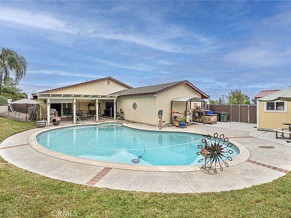 An updated kitchen is crafted for the avid cook with newer built-in appliances. Plenty of handsome cabinetry and tile countertops extending to a breakfast bar complete this delightful culinary space. A gorgeous wood ceiling with exposed beams adds a dramatic touch to the adjacent fireplace-warmed family room. Among the four generous bedrooms, the primary suite tops all with direct outdoor access and an elegant ensuite with a walk-in shower. Upgraded vinyl fencing lends privacy when relaxing in your very own Swimming Pool and spa or dining al fresco under the pergola. Bonus features include a newly built Tuff Shed and an attached 2-car garage with a revamped concrete slab driveway. Come for a tour while this gem is still available!!