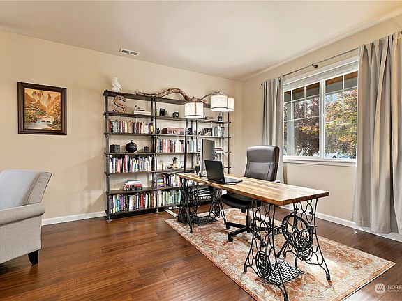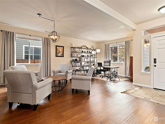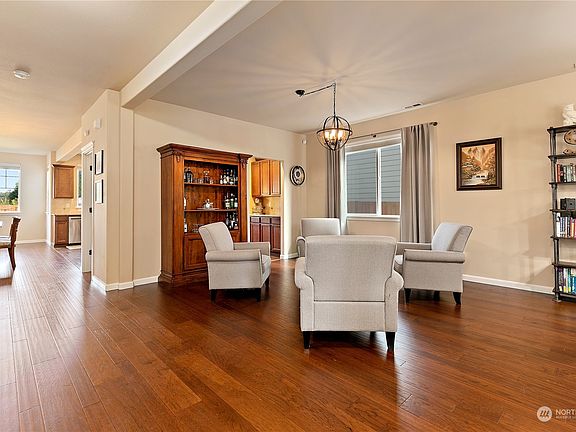 Don't miss this beautifully maintained 5bdr/2.5 bath Yelm home. This stunning home welcomes you with a covered front porch, engineered hardwood floors, an eat-in kitchen with granite countertops and a walk-in pantry, a butler's pantry, a living room w/ a gas fireplace, formal dining room, office, and a half bath. The upper level features a loft area, HUGE primary bedroom with gas fireplace, enormous walk-in closet and a 5 piece bath, 4 additional bedrooms, one with a built in murphy bed, a full bath with a new tub and surround, and a large laundry room. New A/C, exterior paint and trim. The spacious back yard is fully fenced with a patio for entertaining, firepit area, raised garden beds, and a storage shed. 2 car garage.