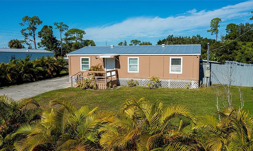 Welcome to 15312 Mango Dr, a CHARMING 3-bedroom, 2-bath manufactured home situated on an oversized, EXTRA DEEP 80 x 150 PRIVACY FENCED lot! This delightful property offers plenty of space for your lifestyle needs and hobbies. ENJOY THE HUGE 24 x 24 DETACHED GARAGE with opener plus door entry—perfect for a workshop, parking all your toys, or extra storage. The home features a beautiful METAL ROOF that adds durability and curb appeal. Relax on the raised front porch, ideal for enjoying cool cross breezes or unwinding under the stars in the evenings. Inside, the split floor plan includes a spacious living and dining room combo perfect for comfortable living and easy entertaining. The galley kitchen is functional and convenient, with abundant cabinetry and counter space and pantry making meal prep a breeze. There is also a spacious inside laundry room for added convenience. The serene master bedroom offers a nice ensuite bath for privacy and comfort. Bedrooms two and three are generously sized, perfect for visiting guests who will appreciate the shared bathroom easily accessible from the rest of the home. Recent updates include a new metal roof on the home (2021) and a new garage roof (2022). Best of all, there are NO HOA or PARK FEES, NO PARK RULES, providing you freedom and flexibility. Just a short drive to downtown historic Punta Gorda, offering community events and LIVE entertainment, Ponce De Leon Park, boutique shops , waterfront fine and casual dining, fun music/art festivals, Punta Gorda Airport, popular Fishermen’s Village with quaint shops and cafes , pickleball PLEX, farmers market, Tampa Bay Spring Training facilities, Sunseeker resort - Florida's Premier Gulf Coast Oasis too and fabulous art district. Don’t miss this opportunity to own a spacious home on a large lot with room to grow and play! SCHEDULE YOUR APPOINTMENT TODAY to experience all this HOME has to provide !