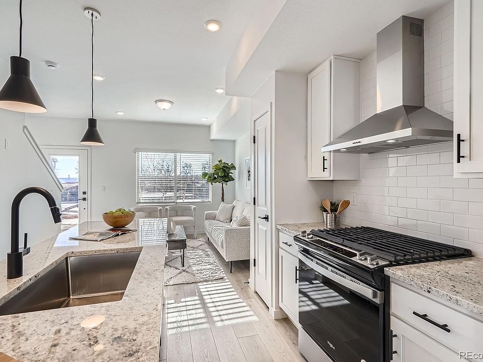 Gas rangeGranite countertopsOpen-concept kitchenStriking tile backsplashThoughtfully appointed upgradesBlack hardware accentsFunctional two-story floor plan