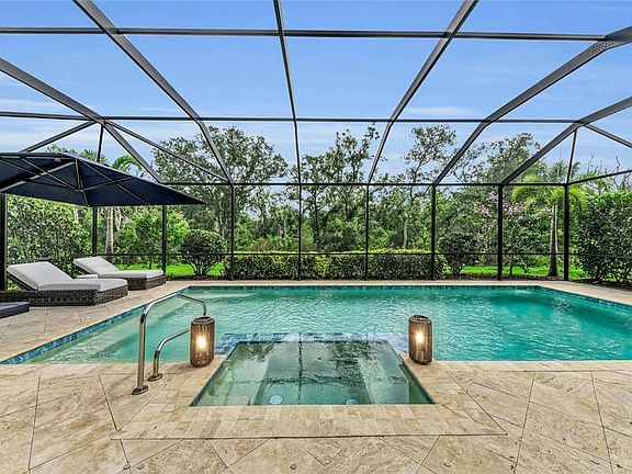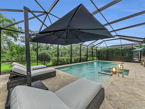 Cozy propane fire pitExtended lanaiSpacious bedroomsOversized heated saltwater poolGleaming quartz countertopsNatural gas rangeLush tropical landscaping
