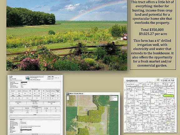 This farm is located approx 10 miles east of Havana on Rt 136, then south on CR 2600E. Look for signs. This tract offers a little bit of everything: timber for hunting, income from crop land and potential for a spectacular home site that overlooks the property. This farm has a 6” drilled irrigation well, with electricity and water that extends to the bunkhouse. It also offers the opportunity for a fresh market and/or commercial garden. $9,025.27 per acre