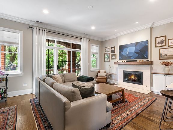 This one-of-a-kind, picture-perfect Lincoln Park condo feels straight out of a design catalog, perched on an extra-wide (35x125) corner lot overlooking the lush expanse of Wrightwood Park. With three distinct outdoor spaces-including a private roof deck offering unobstructed views of the city and neighborhood-this home is a rare gem. Inside, the three-bedroom, two-bath residence impresses with its generous proportions, 10-foot ceilings, and rich dark newly refinished hardwood floors throughout. Situated on the corner of an all-brick building, the condo is bathed in natural light thanks to its desirable South/East-facing orientation. The spacious living area features a fireplace and sliding glass doors that open to a front-facing balcony with idyllic park views. The kitchen, updated in 2024, showcases a new sleek quartz extended and large island and countertops, new appliances,freshly painted white cabinetry and brand new sink and faucet. A coveted pantry closet adds functionality, while the adjacent dining area-with a custom built-in bench and handcrafted table-opens onto a second balcony, perfect for al fresco dining or grilling. The open space concept is exactly what someone is looking for to entertaining guests, family and friends. The private roof deck is an entertainer's dream, complete with a plumbed rooftop bar, built-in grill, sink, refrigerator, and fireplace. The oversized primary suite offers a spa-like retreat, featuring a luxurious soaking tub, separate steam shower, double vanity with high end polished granite countertops. The second bathroom with newer finishes is conveniently located down the hall from the 2nd and 3rd bedrooms which both also have custom built-in plantation window treatments. Fully custom-built bookshelf in the 2nd bedroom allows for extra storage lends itself as a potential office if needed. Throughout the home, new lighting fixtures and window treatments add a polished touch. Designed with sustainability in mind, the property includes Geo-Thermal HVAC for eco-conscious living and brand-new stackable washer and dryer. Wrightwood Park just steps from your door is ideal for recreation and relaxation. With low monthly assessments and a garage parking spot included, this condo combines luxury, location, and lifestyle in perfect harmony.