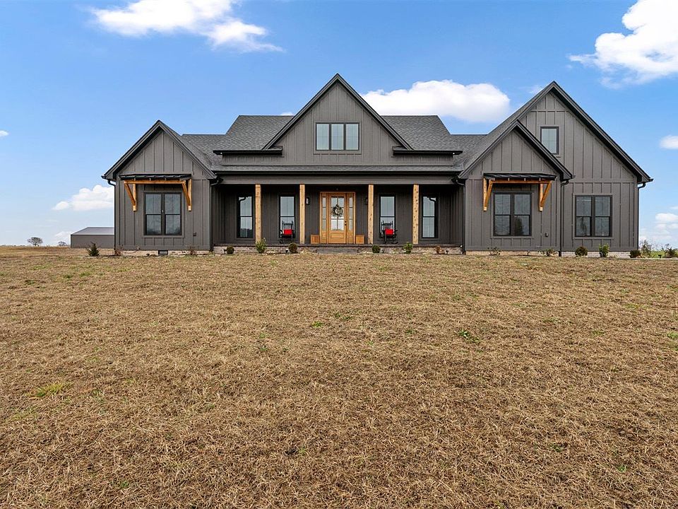 Step into elegance in this meticulously designed home featuring brick accents, hand-hewed beams, and upgraded cabinetry. With vaulted ceilings, 3 bedrooms, an office, and 2.5 baths on the main level, each room boasts an accent wall, large closets, and luxurious details like tile showers and double vanities. The upstairs bonus room or 4th bedroom with a full bathroom provides versatility. Enjoy the warmth of a gas fireplace and the culinary delights from ZLINE Appliances. Abundant storage space is a bonus. Nestled on 12.5 acres, relish breathtaking country views from both front and back. Adding to the allure, a 5,000 sq ft detached shop with plumbing completes this exceptional property. Welcome home to comfort and style.