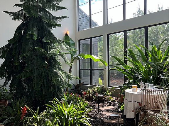 Designed with entertainment in mind, the home boasts unique features such as a two-story indoor plant atrium, and a 43’ window wall in the living/dining/kitchen that looks out onto the lake.