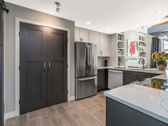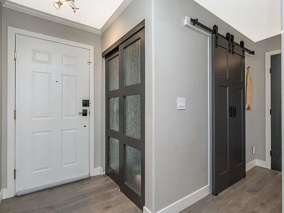 For more information, click the Brochure button. This tastefully updated Top Floor, quiet, south-facing, 2bed, 2bath home with soaring 14ft vaulted ceilings in living room and master bedroom is a must see. Large windows let in lots of light. Updates include newly renovated laundry/storage room with Miele W/D, master bathroom/shower, energy efficient Mysa thermostats, baseboard heaters, all ceiling fixtures, all screwless light switches/outlets, door hardware, barn doors, ceiling fans. Newer flooring throughout with stone kitchen and bathroom counters, subway tile backsplash, modern blinds and more. New roof in 2025. Gas and water included in strata fees. Close to transit/shops. 1 parking spot. 1 storage locker. Pets with restrictions. Do not miss out!