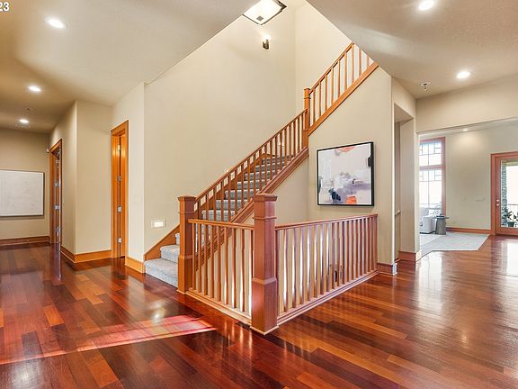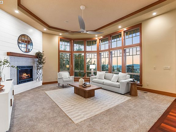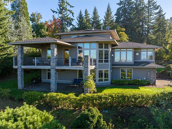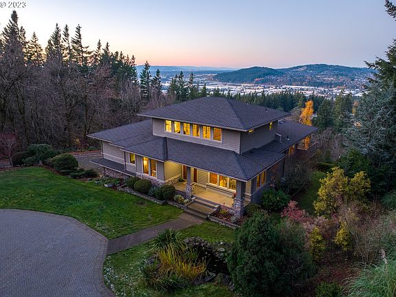VERY RARE FIND! Incredible views from downtown Portland to 3 majestic mountains and rolling hills as far as the eye can see! Private, gated custom home on 3.4 acres with two primary suites! Entertainer's deck! Walk-in closets in all four bedrooms. Has very high demand Main Level Living! This gem boasts a gourmet chef's kitchen, Butler's pantry, large eat-in kitchen area, formal dining, incredible floor to high ceiling windows, hardwood floors, office, huge walk-in shower with heated floors, 2-sided fireplace from primary bedroom to the foot of a luxurious soaker/air tub, 8' tall solid wood doors throughout! 3 car garage and house generator. Lower level has guest primary suite/ADU potential with large indoor/outdoor living space and separate entry. Beautiful waterfall feature, landscaped grounds with vast irrigation system and land with tons of potential, a gardener's paradise! Nearby walking trails. Amazing property and private oasis!