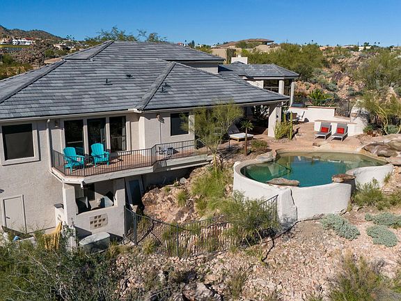 A home that feels like it was discovered, not built. Perched amid massive rock outcroppings, this one-of-a-kind home located on the prestigious street of Sunburst Drive rises naturally with the desert unfolding around it like a private sanctuary. From the moment you arrive, the setting feels cinematic: sun-warmed boulders, endless mountain silhouettes, and the kind of quiet you can feel. Step inside and the views follow you—framed in the plethora of windows are mountain views, open desert, and majestic sunsets. This fully remodeled home boasts soaring ceilings, and plenty of room to share its beauty with family and friends with 4 bedrooms and 2.5 baths along with a formal dining room, living room, eat-in kitchen, huge granite kitchen island with waterfall that seats 6, a family room with fireplace, hardwood flooring throughout (no carpet), and beautiful marble slab shower and marble counters in all the bathrooms. Choose your view from the multiple balconies and patios, watch the sunset over the McDowell Mountains, or gaze at the iconic Red Mountain out your bedroom window. The beautiful finishes are just the start, this home also has a brand new roof including new tiles, fresh paint and much more (check out the updates list in the documents tab). The acre lot gives you endless room to breathe and relax. And with this much space, you can expand the home or choose to build an additional dwelling unit, the possibilities are endless. Enjoy the rare privacy that comes from having nature as your closest neighbor, but still so close to Scottsdale. A retreat, a statement, and a piece of the desert's quiet majesty, all wrapped into one unforgettable Stoneridge property. View it today before this one of a kind home is sold.