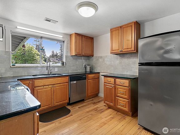 Well-maintained Kent Rambler with RV parking and flexible living space. Enter through the covered foyer and keep the mess outside. Granite counters and stainless appliances in the kitchen are ideal for those who love to cook. Three bedrooms are located on one side of the home, with an office, bonus room, and family room on the other—great for work, hobbies, or guests. The fully fenced backyard features a dog run, storage shed, and garden space. Ample driveway space and designated RV parking offer room for multiple vehicles, toys, or trailers. Nearby access to Hwy 18 and 167 makes commuting easy. Shopping, dining, and recreation—including Pacific Raceways and Flaming Geyser State Park—are all close by.