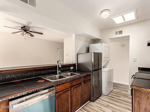 Stylish neutral tonesGalley-style kitchenPlenty of natural lightTiled countersSpacious cabinetryWood-look flooringNew ss appliances