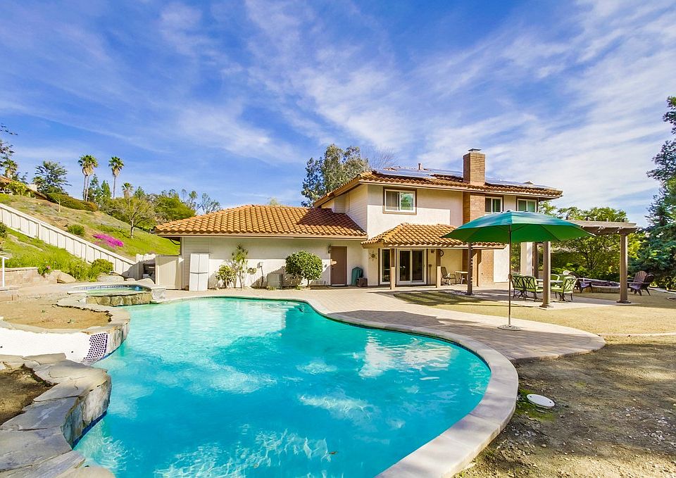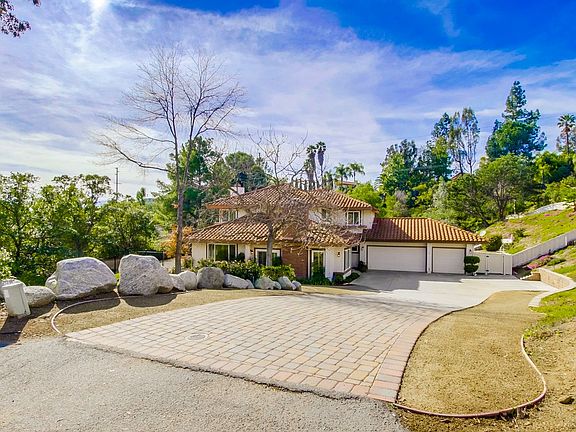 AMAZING 1+ ACRE POWAY ESTATE WITH 5 BEDROOMS (ONE ON THE MAIN LEVEL) AND 4 UPSTAIRS, 3 BATHS, 3 CAR GARAGE AND OVER 3200 SQ FT. LOTS OF NATURAL SUNLIGHT BEAMS THRU NEWER WINDOWS WITH PLANTATION SHUTTERS AND DOORS. PEACEFULLY LOCATED AT THE END OF THE CUL-DE-SAC. THE LANDSCAPING VERY WELL DONE WITH DROUGHT TOLERANT LANDSCAPING, MULTIPLE BRICK PAVER PATIOS, NEWER GAZEBO, AMAZING POOL WITH BUILT IN WATER SLIDE AND SPA. 100% OWNED SOLAR SYSTEM THAT REDUCES THE YEARLY ENERGY TO CLOSE TO $0...MUST SEE HOME!