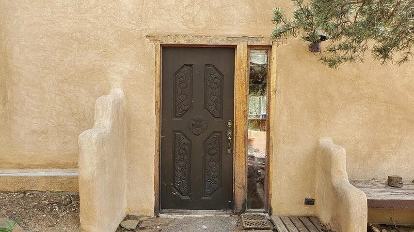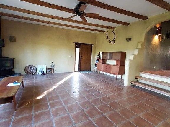Wooded acresSmall deckSouthwestern style homeIn-floor heating systemDining areaWood stoveStorage rooms
