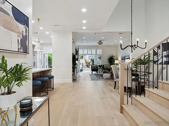 Welcome to Alcala in Rancho Santa Fe's coveted Whispering Palms, a gated enclave offering picturesque golf course views. This 3-bedroom, 2.5-bath, 2,479-square-foot townhome was fully reimagined in 2023, blending Coastal Contemporary elegance with meticulous craftsmanship. Every detail impresses, from wide plank White Oak flooring to the Quartz waterfall island, Thermador appliances, and designer lighting. Modern luxury features include owned SOLAR, upgraded HVAC, and smart home technology. The expansive kitchen, with custom cabinetry, a wine fridge, and wet bar, is an entertainer's dream. Upstairs, the serene bedrooms offer spa-inspired bathrooms with curbless showers and LED-lit mirrors. The primary suite boasts a private terrace and a custom-built walk-in closet. Enjoy peaceful outdoor spaces and access to Alcala's pool and spa, all while being minutes from Rancho Santa Fe's finest dining and shopping.
