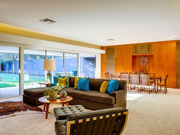 Stop-In the name of love! This Supremely newly-renovated, Mid-Century Modern time capsule is located on a quiet cul-de-sac, adjacent to the Altadena Town and Country Club and golf course. The open floorplan features many of the innovations of Case Study houses, with dramatic site lines that frame the views of manicured landscaping, mature trees, and the San Gabriel mountains. Upon arriving, one is struck by the design, entryway, color palette. The Terrazzo entry leads from the outside in. The kitchen boasts wonderful prep areas, a built-in desk, and an eating area looking out to the front yard. The cabinets have been meticulously restored and freshly stained. High-end appliances abound. A laundry area and half bath are adjacent to the kitchen. There's a fantastic pass-through to the living room that adds to the Mid Century vibe--complete with Danish Modern table and chairs. It's an entertainer's dream. Now step into the expansive living/dining room. On one side is the living area with its impressive Flagstone fireplace and warm wood paneling above. On the opposite side is a wall of rich wood panels that pop open to reveal an abundance of storage and media cabinet. Both areas look through a wall of glass to the covered back patio and large, private yard--furnished with newly restored vintage Brown Jordan furniture. Moving through the home, there is a bonus area with built-in desk perfect for home office or crafts room. The first bedroom is charming with perfectly restored wood paneling, bookcase, and built-in desk. The second bedroom is a delight with built-in drawers and display. The bedrooms share a full bath that pops in perfect colors. Be amazed at the spaciousness of the primary bedroom suite with views to the yard and a sliding glass door to the patio. A dressing room, vanity, two closets and more built-ins lead to the second bath, which offers its own privacy screen and patio. So much has been improved and updated. See the features page attached to this MLS. This is 'The Happening'!