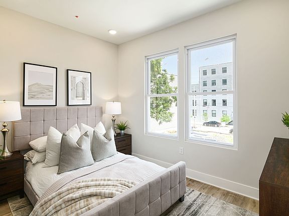 The bedroom offers a peaceful escape with plush carpeting, ample closet space, and a warm, neutral palette that instantly feels like home. The spa-inspired bathroom boasts modern tilework, a floating vanity, and a deep soaking tub perfect for unwinding after a long day.