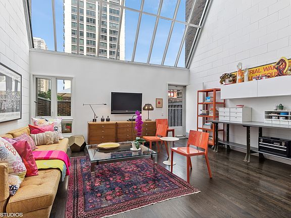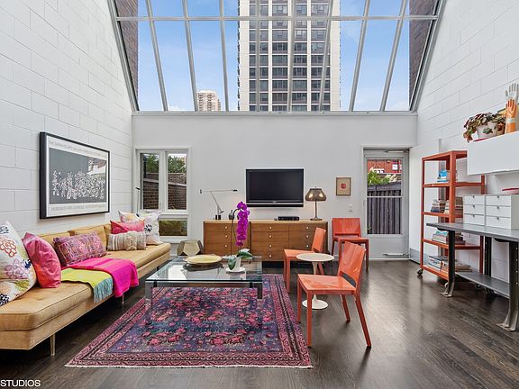You'll swoon over this amazing and rarely available Sandburg Village Artists Loft. Renovated to highlight the light and airiness of this dramatic space, an additional half bath was added to the first floor. The kitchen and full bath were completely renovated with sleek, white, European-styled cabinets and fixtures and in-unit laundry was added. This loft-like, one bedroom townhome is a dramatic residence offering a unique style of city living. Architecturally, the mid-century modern style is certain to please, with soaring ceiling heights which allow light to flood in from above. This two-story townhome is compelling and unique at every turn. Light streams in from a 17 foot span of paneled windows. Wander outdoors onto a large and private, enclosed patio. The North Pool of Sandburg Village is out the back gate. Situated on the north end of Sandburg Village, this gem of a home is close to the lakefront, parks, public transportation and the bustling Wells St corridor, as well as Old Town and Gold Coast shops, restaurants and entertainment. Parking is in Sandburg Village north lot that is right out the back door. Dramatic yet cozy, this serene space is but a stone's throw to the best of Old Town, Gold Coast, River North and beyond. This is definitely a one-of-a kind option in northside living.