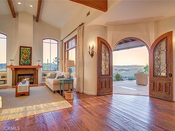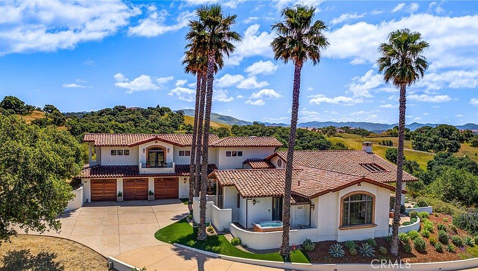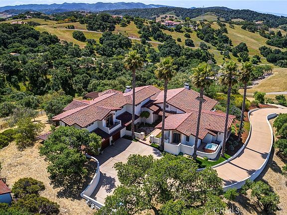 Your elegant estate within the highly sought after community, Varian Ranch awaits. This sensational residence provides striking curb appeal and sprawling views of the Central Coast and a tranquil living environment. Pulling into the private, gated, and illuminated driveway, the elegant architecture and expansive views of the seven sisters, rolling coastal hills, beautiful country sides provide a sensational setting. The front courtyard has a multi-tiered water feature, landscaping and handmade wooden front door with Spanish style architecture. This spectacular one-of-a-kind custom residence lives as a single-story with two guest suites on the upper level with a den and walk out view deck. Upon entering the home, there are high beamed ceilings and several custom French doors that open to the wrap around outside patio. Throughout the home, there is an abundance of natural light and extraordinary views. Unique and hand selected light fixtures, a large fireplace, and a wet bar complete the family room leaving no expense or detail spared. The living room provides a relaxing environment with French doors that open to the cascading hills and allow for indoor/outdoor living. The living room has grand views and opens to the family room. The kitchen is complete with a built-in cook top, range hood, trash compactor, built-in fridge/freezer, double built-in oven, a warming drawer, and a microwave and fireplace. The kitchen has a walk-in pantry and views that overlook oak trees and rolling hills. Outside the dining nook is a built-in BBQ, outdoor sink, and a dining area. The large laundry and utility room has a built-in ironing board, cabinets, and connects to the kitchen and to the 3-car garage. The office has built-in cabinets and French doors and serves as a perfect at-home workspace or study. The primary suite captures the breathtaking views, has a fireplace, a walk out patio, new private hot tub that overlooks the seven sisters & a grand walk-in closet. The primary bathroom is finished with a spacious shower providing views and dual shower heads and a laundry closet. Varian Ranch is a 3,127-acre private ranch with 25 miles of hiking, biking, and equestrian trails. This community provides a 40-stall barn complex, 10 pastures, and a 35,000 square foot riding arena with a 55-foot diameter round pen. The community has a ranch house community center, large swimming pool and heated spa, two tennis courts, and a community fruit orchard with citrus and fruit trees.