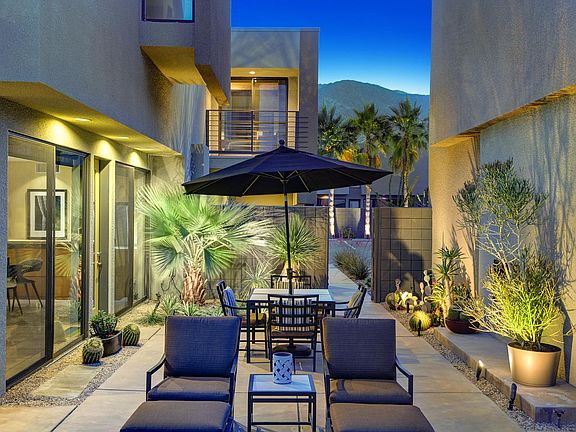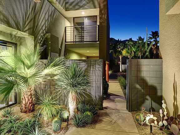 Minimum of 12 months rental. Unique modern style reflective of Palm Springs mid-century architectural heritage interpreted for the 21st Century w/ the ultimate indoor/outdoor living. This exquisite + posh townhome has the convenience of a condo w/the feeling of a private residence. Oversized private outdoor space w/ mature landscape, your own saltwater pool/spa (high-efficiency pool heater + 2-speed pump), outdoor fireplace for brisk winter nights, perfect orientation allows great Mtn view from inside + outside, 2 separate En-suite masters upstairs, soaring high ceilings, skylights + clerestory windows bring in abundant light, open floor plan, fireplace in the living area. Centrally located, minutes from downtown + design district, shopping, restaurants, movie theaters, gym, casino, tennis, golf, more. Built by well-regarded developer Palm Springs Modern. Water, Cable TV, and Internet included.